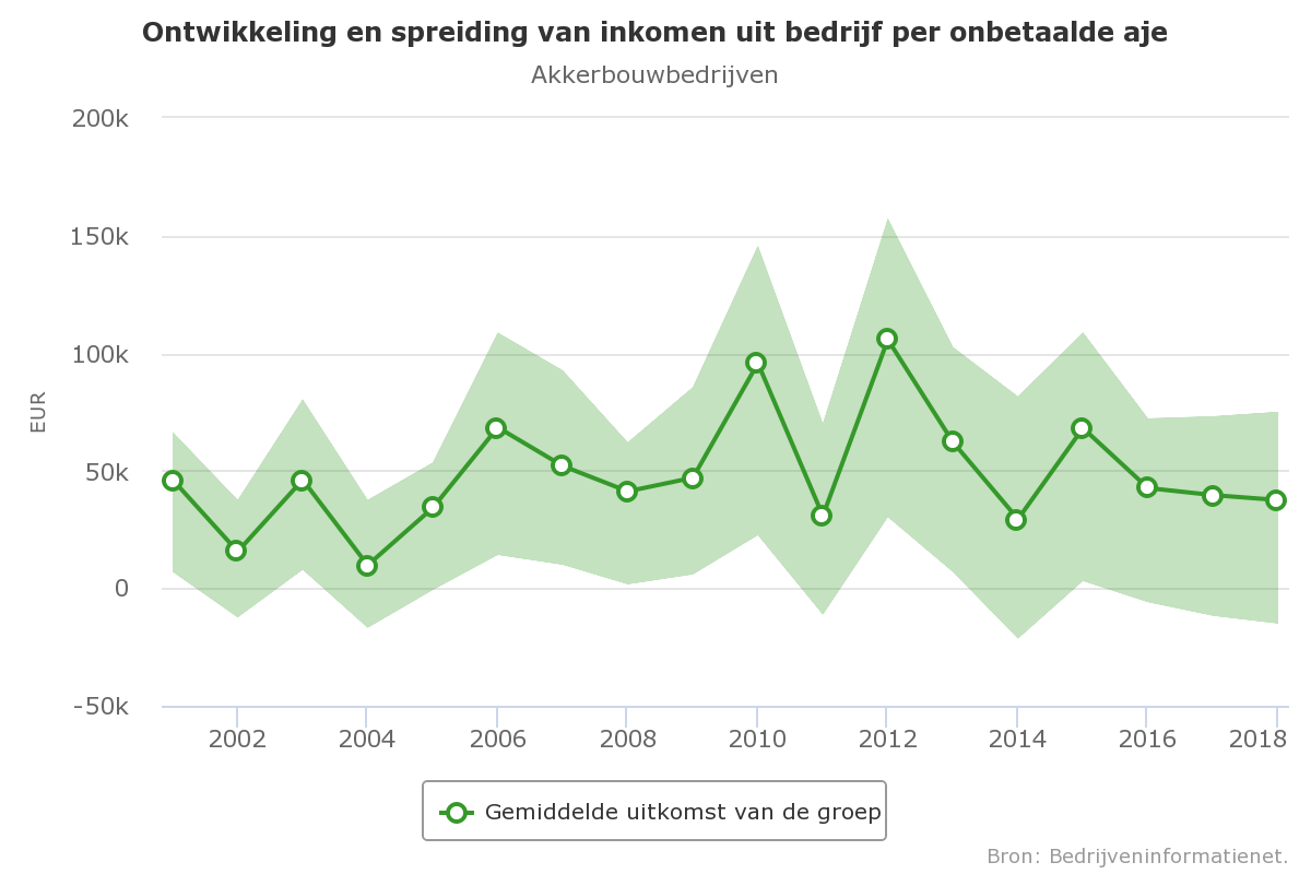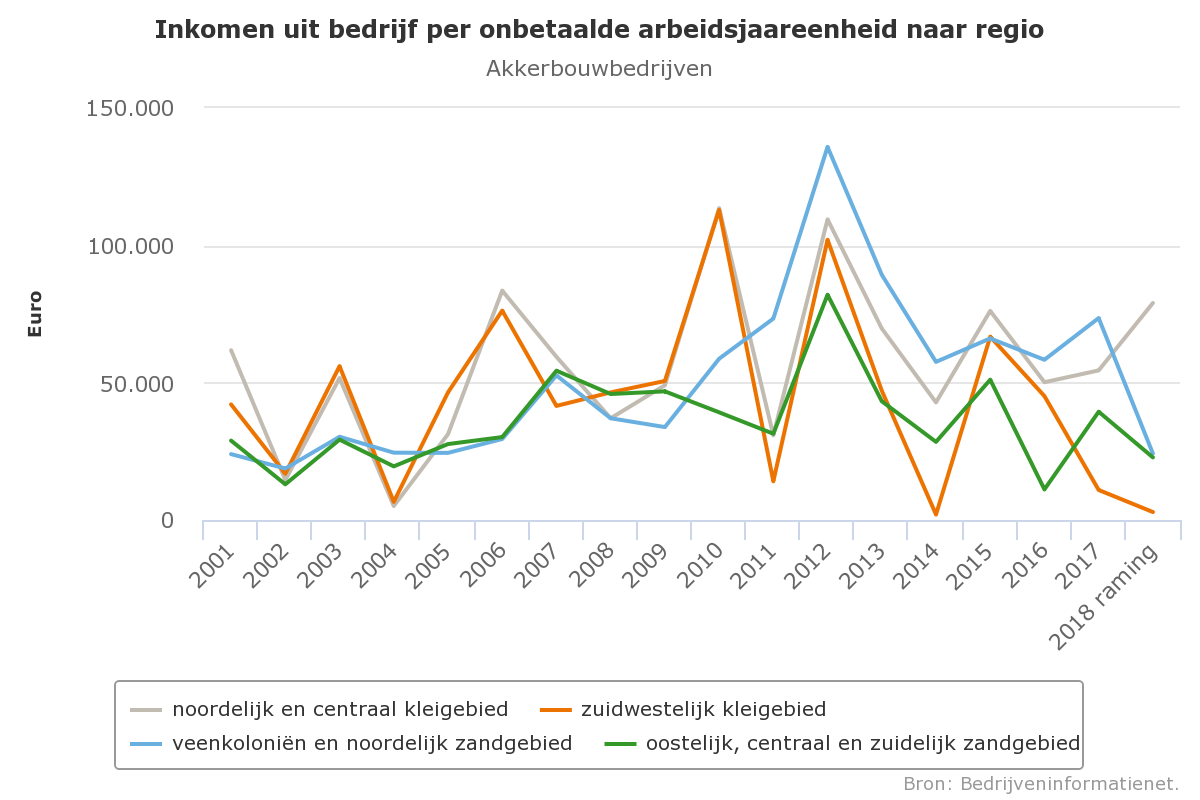 De spreiding in bedrijfsresultaten tussen de akkerbouwbedrijven is erg groot (zie ook indicatoren productieomstandighedenen prijzen). Meer dan 20% van de akkerbouwbedrijven zal naar verwachting in 2018 een inkomen realiseren dat minder is dan 15.000 euro negatief. Akkerbouwbedrijven in het Zuidwestelijk Kleigebied kampten met zeer lage producties van de belangrijkste akkerbouwgewassen. Het geraamde inkomen uit bedrijf per onbetaalde aje voor de bedrijven in deze regio bedraagt ongeveer 3.000 euro.
