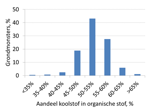 Het koolstofgehalte in de organische stof in Nederlandse bodems laat een enorme spreiding zien. Dit gehalte varieert van 40 tot 65%. Dat blijkt uit een recente analyse van ruim 100.000 grondmonsters door Eurofins Agro.