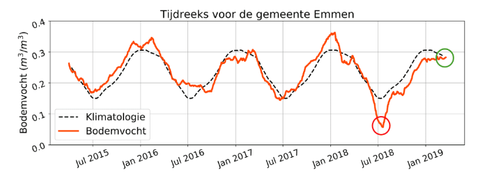 Door recente technische ontwikkelingen is het nu mogelijk om met geavanceerde satellieten van NASA en ESA deze vocht condities in kaart te brengen. In het onderliggende figuur (1) hebben we deze technologie toegepast en de sterkte van de droogte bepaald voor elke gemeente in Nederland. Dit hebben we gedaan aan de hand van een meerjarige dataset die verkregen is uit satelliet observaties. De gemeente Emmen in het oosten van Nederland laat de grootste uitslag zien op gemiddeld de droogste dag. Eind mei 2018 dook het bodemvocht onder het normale niveau en bleef daar bijna 10 maanden onder. De regen van de afgelopen weken hebben eraan bijgedragen dat we nu langzaam weer op een normaal niveau zitten, zie grafiek 1.