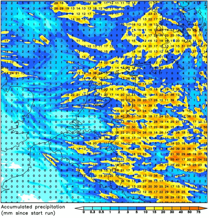 Totale verwachte neerslag voor donderdag en vrijdag (bron: WeerPlaza)