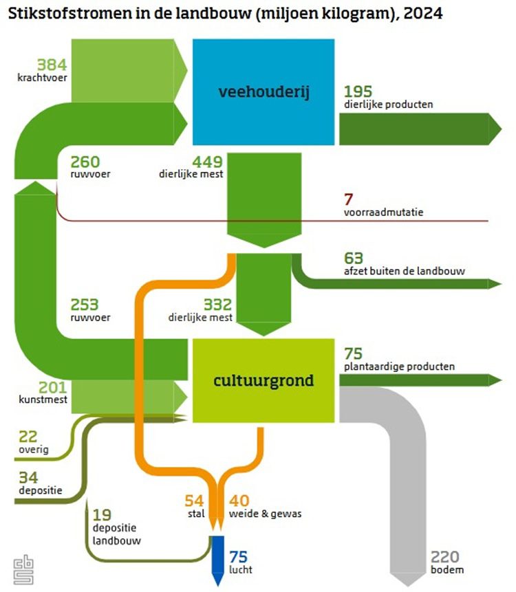 De uitscheiding van stikstof in dierlijke mest bedraagt 449 miljoen kilogram, drie procent minder dan in 2023. Hiervan is 332 miljoen kilogram stikstof aangevoerd naar landbouwgrond.