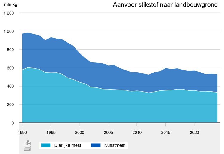 De twee grootste aanvoerbronnen van stikstof in de landbouw zijn krachtvoer (384 miljoen kilogram) en kunstmest (201 miljoen kilogram). De aanvoer van stikstof via krachtvoer neemt met drie procent af ten opzichte van 2023, doordat het stikstofgehalte in krachtvoer lager is en doordat de veestapel krimpt. Er is 201 miljoen kilogram stikstof gebruikt in de vorm van kunstmest, dat is twe procent meer.