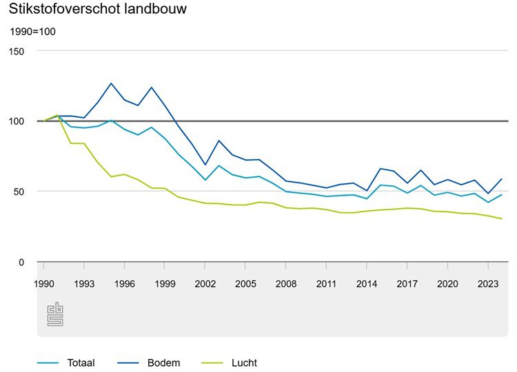 Het stikstofoverschot is meer dan de helft lager dan in 1990. Dit blijkt uit de mineralenbalans landbouw van het Centraal Bureau voor de Statistiek (CBS).