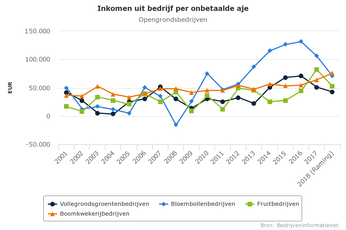 Het inkomen uit bedrijf bedraagt in 2018 naar schatting circa 45.000 euro per onbetaalde aje. Dit is evenals in de vier voorgaande jaren ruim boven het langjarige gemiddelde over de periode 2001-2017.