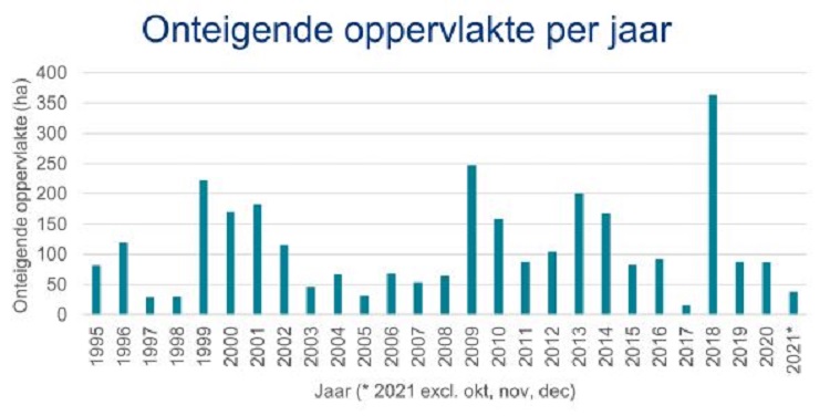 Hoewel het aantal onteigeningen en onteigende percelen sinds 1995 afnam, fluctueert de onteigende oppervlakte door de jaren heen sterk. Zo is voor de onteigening ten behoeve van de ontpoldering van de Hertogin Hedwigepolder in 2018 meer dan 300 hectare landbouwgrond onteigend.