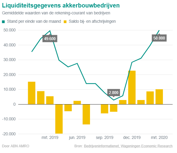 De coronacrisis laat duidelijk sporen na in de akkerbouwketen maar in het eerst kwartaal van 2020 is daar nog niets van te zien. De stand op de lopende rekening van akkerbouwbedrijven was aan het eind van het eerste kwartaal 2020 vrijwel identiek aan de stand een jaar eerder (50.000 euro). In het eerste kwartaal wordt er doorgaans meer ontvangen dan uitgegeven. De bewaarproducten worden verkocht en afgeleverde producten uitbetaald. In het eerste kwartaal 2020 was de toename op de lopende rekening (saldo van af- en bijschrijvingen) iets lager dan in 2019.