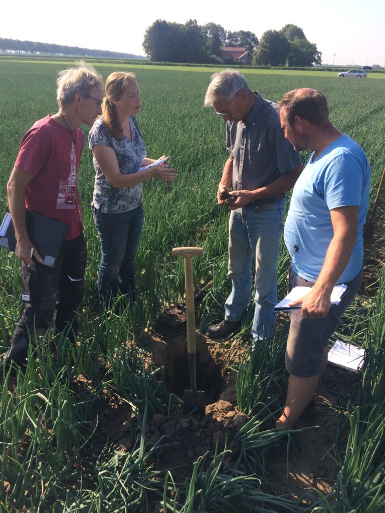 Afgelopen week hebben een viertal bodemdeskundigen, te weten Anna Zwijnenburg (Van Tafel naar Kavel), Coen ter Berg, Jan van Berkum (Aequator) en Christoffel den Herder (Delphy) bij drie percelen, waarvan 1 gangbaar bewerkt en de overige twee percelen met het systeem van voorjaarsploegen gezamenlijk door middel van profielkuilen de bodemstructuur beoordeeld.