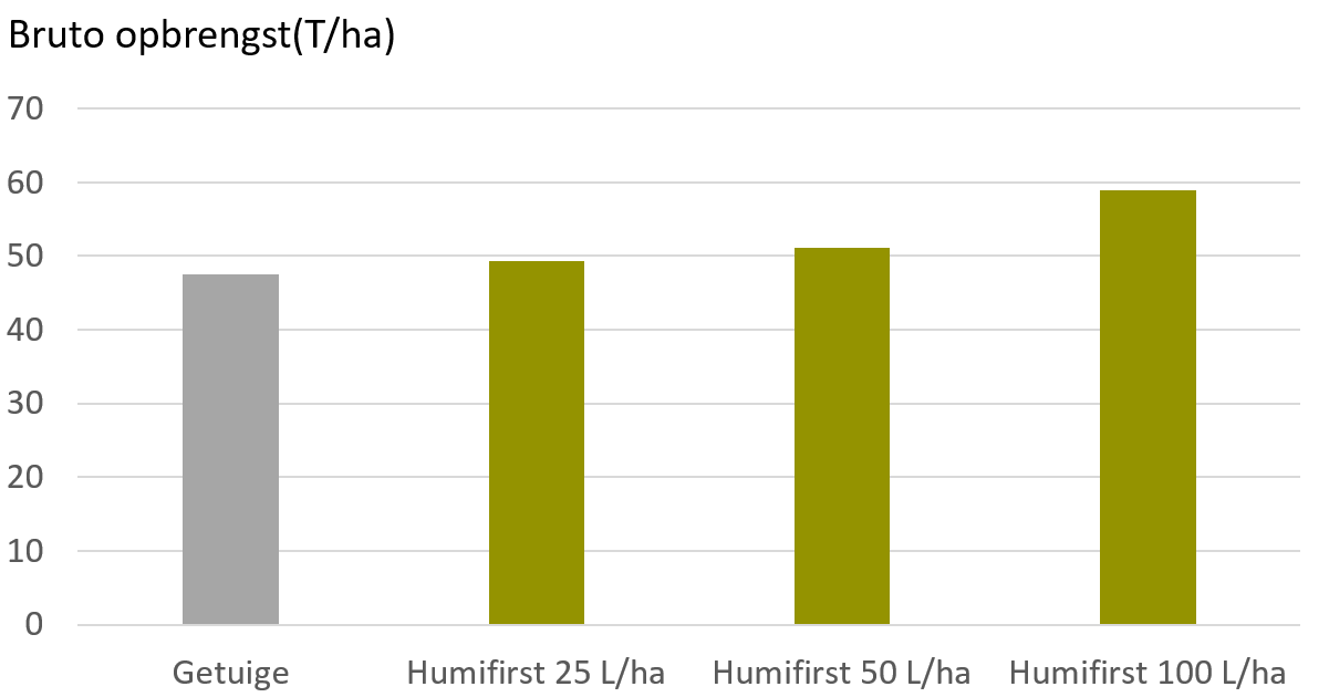 “De proef is gerooid op vijfentwintig hectare per strook van het ras Ivory Russet. Hoewel de basisbemesting overal gelijk was, liepen de opbrengstverschillen tussen het onbehandelde gewas en de aardappelen waar honderd liter Humifirst was toegediend enorm op. In totaal rooide Van Ginhoven twaalf ton meer aardappelen op het honderd liter Humifirst veld: ruim vierentwintig procent meeropbrengst ten opzichte van de referentiestrook. Medio augustus tekende dat beeld zich af: toen waren de onbehandelde aardappelen al een stuk minder groen dan de planten die over Humifirst konden beschikken.”