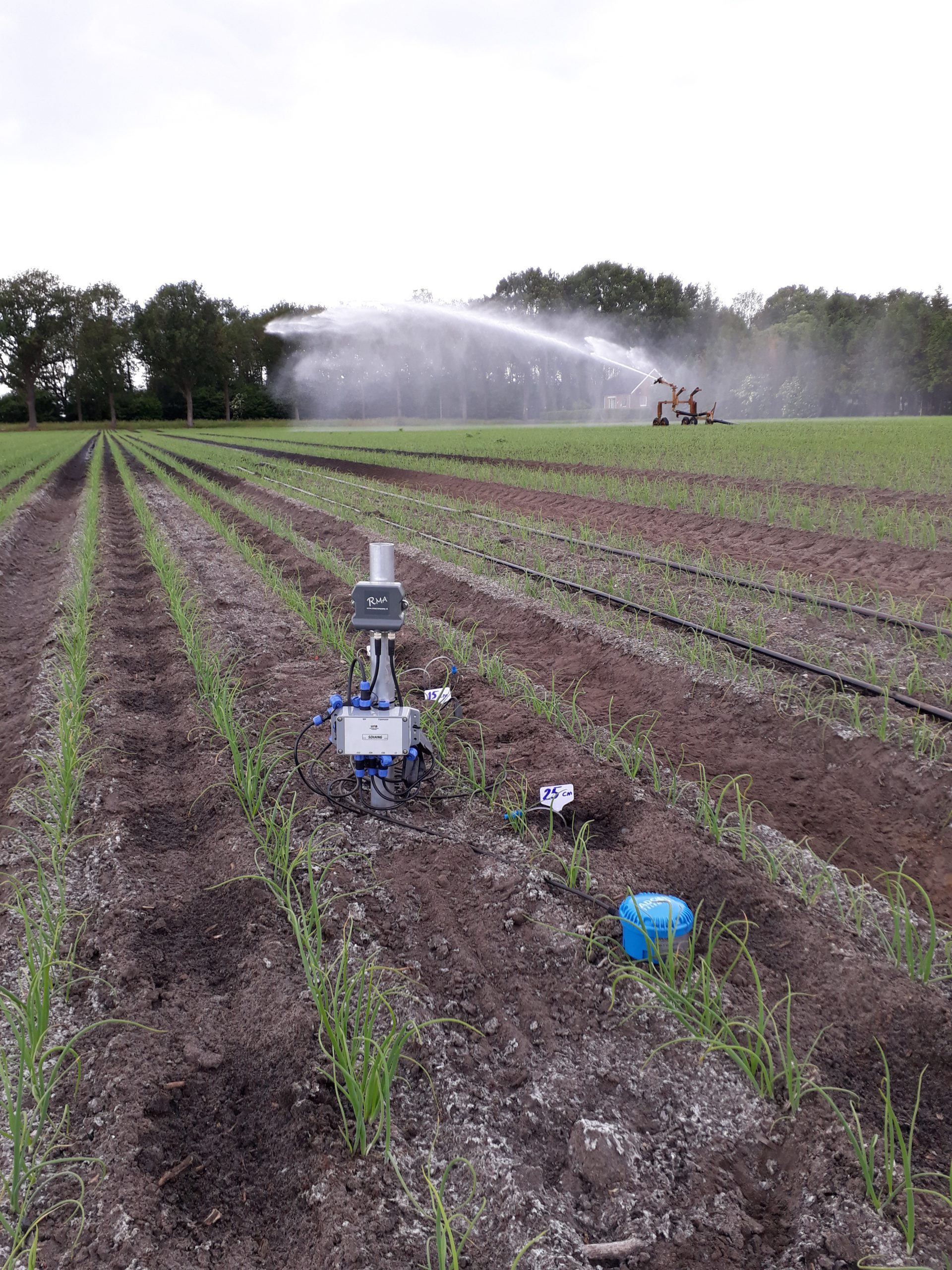 Hierna moet duidelijk zijn hoe robuust en effectief de sensoren zijn en, belangrijker nog, welk rendement ze hebben om de teelt te verduurzamen. De foto (onder) toont de installatie van de sensoren in een perceel uien waar ook druppelirrigatie met haspelberegening wordt vergeleken.