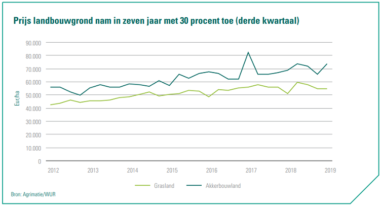 De gemiddelde prijs waarvoor Nederlandse landbouwgrond wordt verhandeld is de afgelopen zeven jaar met circa dertig procent gestegen. Dit jaar kwam er een kentering en daalden de prijzen in het eerste halfjaar. In het derde kwartaal van dit jaar steeg de prijs van landbouwgrond weer. Met name akkerbouwland werd duurder. De prijs van grasland stagneerde. ABN AMRO verwacht dat de prijsvorming van grasland de komende jaren onder drukt staat en sluit prijsdaling niet uit. Terwijl goed akkerbouwland in prijs gaat stijgen. Het rendement in de melkveehouderij is beperkt en het aantal stoppers zal, mede als gevolg van het stikstofbeleid, de komende jaren toenemen. Daarnaast zijn er fosfaatrechten nodig om grasland te exploiteren. Dat drukt de ‘kale’ grondprijs. Het gemiddelde zegt echter niet alles. De prijsverschillen tussen courante, productieve percelen en grond met minder landbouwkundige waarde nemen de komende jaren verder toe.