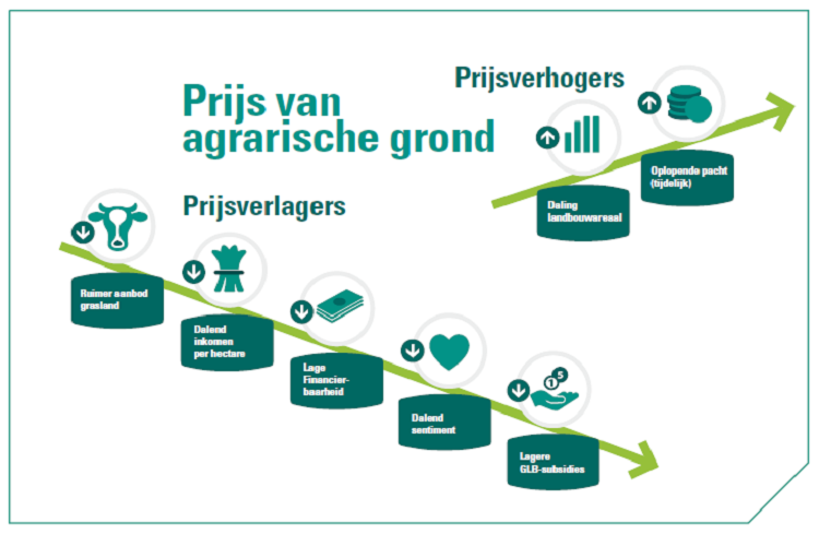 De financierbaarheid van bedrijven speelt hierbij een grote rol. De rente is dan wel laag maar de exploitatie van melkveebedrijven laat het vaak niet toe om grond te kopen. In de akkerbouw zet kringlooplandbouw het exploitatiesaldo onder druk. Daarbij zijn banken minder bereid om hele lage aflossingen te accepteren. De stuwende invloed van subsidies op de prijs van landbouwgrond is beperkt maar zal verder afnemen. Deze laatste factoren gelden voor zowel grasland als akkerland. Hieronder geven we schematisch weer welke factoren zorgen voor een verhoging van de prijs en welke voor een lagere prijs.