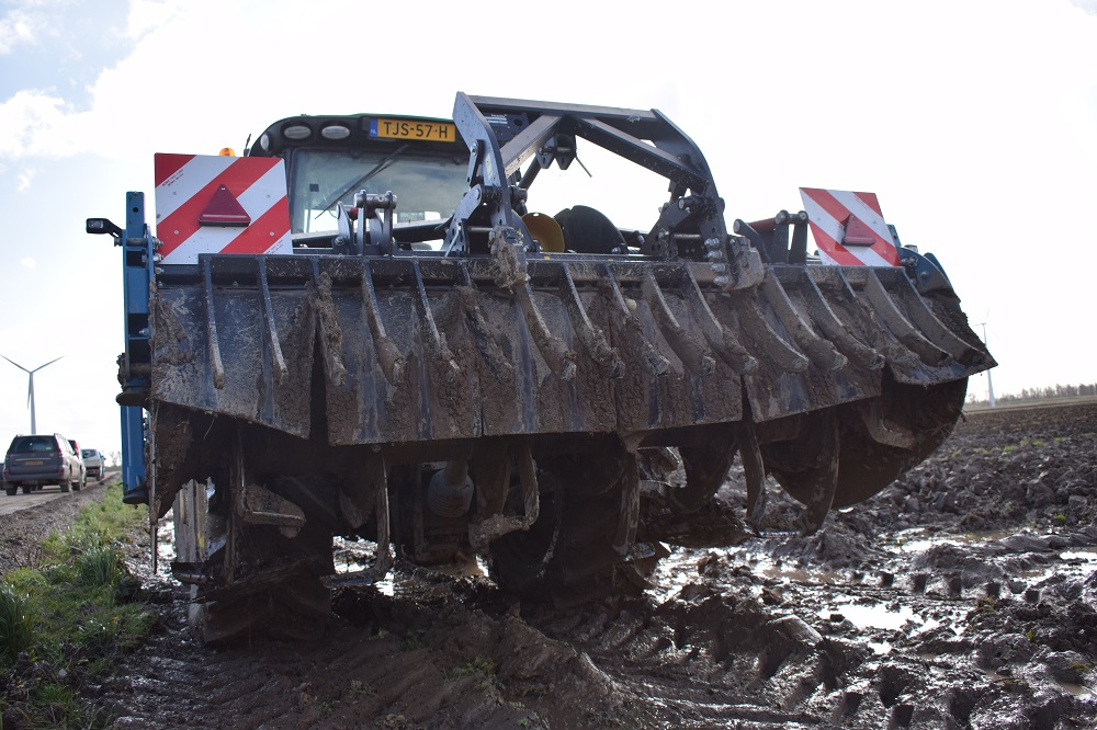 “Er zit daardoor nauwelijks zuurstof in de grond waardoor het bodemleven niet goed kan overleven en er geen waterbergend vermogen is. Het is belangrijk dat die losgemaakt, wordt maar het is zo nat dat er niet geploegd kan worden. Dan is de spitmachine echt een goed alternatief, zowel onder goede omstandigheden als onder minder goede.”