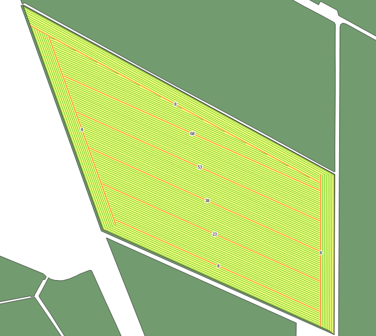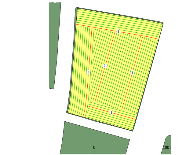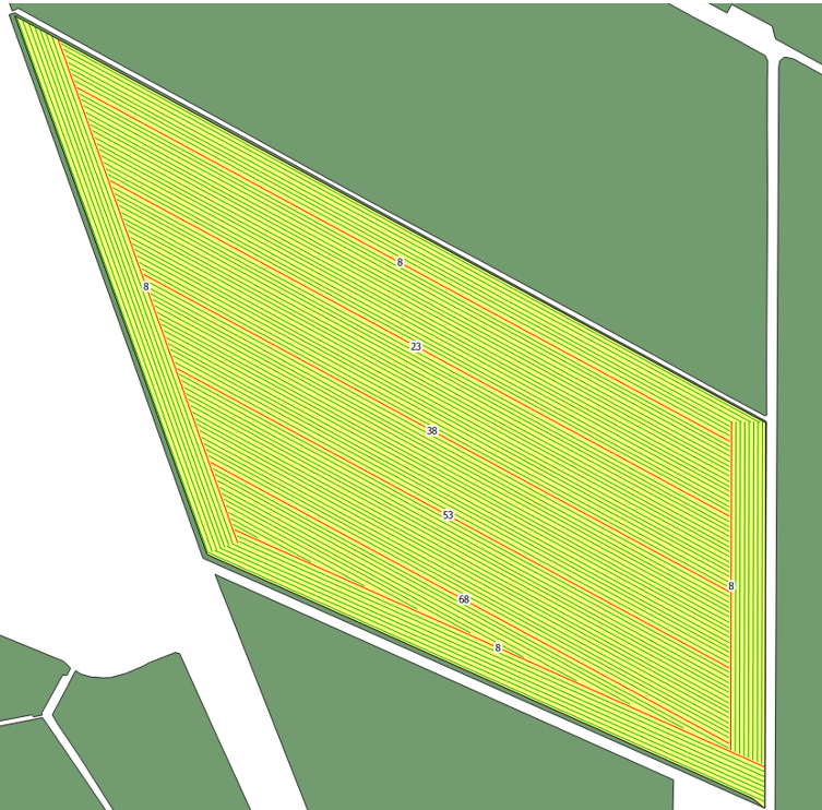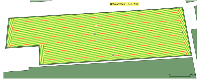 Voor de perceelvorm geldt, dat de output in beginsel groter is naarmate het perceel (ofwel de gemiddelde pootganglengte) langer is. Het huiskavel hieronder is iets meer dan 800 m lang.