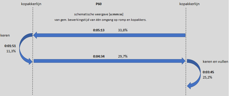 Wanneer je de vultijd zou weten te decimeren tot 0 s zou de output oplopen tot 1,12 ha/uur, d.w.z. een verhoging van 15%.