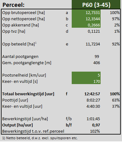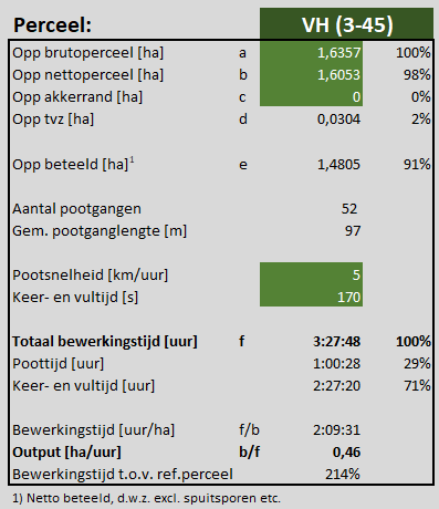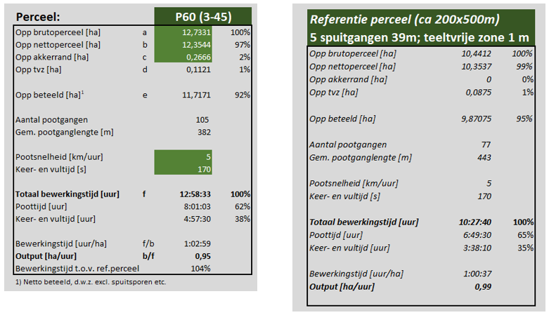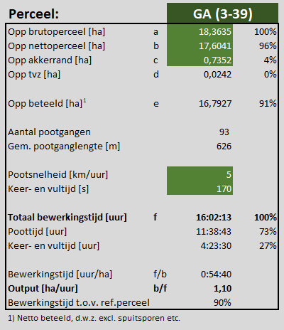 Schema 1 en 2: De waarden in de groene vlakken zijn handmatig ingevuld. De oppervlaktes komen uit GAOS. De pootsnelheid en de keer- en vultijd zijn ontleend aan de eerdergenoemde analyse van de as-applied pootdata. Bij de totale bewerkingstijd is geen rekening gehouden met langere onderbrekingen (> 10 min) om te eten etc. Bij 'bewerkingstijd t.o.v. referentieperceel' wordt een vergelijking gemaakt met een 'ideaal' rechthoekig perceel van ongeveer 10 ha (schema rechts) waar precies 5 spuitgangen (39m) in passen. (bron: HWodKa)
