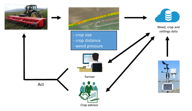 Tijdens het schoffelen meet de machine zowel het gewas (aantal en grootte) als onkruiddruk (aantal). Deze worden automatisch geüpload naar een farm management systeem, waar deze wordt gevisualiseerd in heatmaps. WUR voegde voor het onderzoek een gewasgroeimodel voor sla toe aan het farm management systeem. Zo'n model maakt op basis van data over het gewas én de weersverwachting een prognose voor de groei van het gewas.