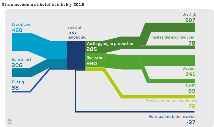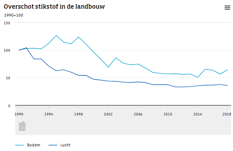 Het stikstofoverschot in de landbouw is in 2018 met ongeveer 8 procent toegenomen ten opzichte van een jaar eerder, tot 330 miljoen kilogram. Het grootste deel (241 miljoen kilogram) ging verloren naar de bodem, 13 procent meer dan in 2017. Het verlies van stikstof naar de lucht daalde met 5 procent naar 89 miljoen kilogram. Door de droge zomer vielen oogsten tegen en werd er minder stikstof opgenomen door gras en gewassen.