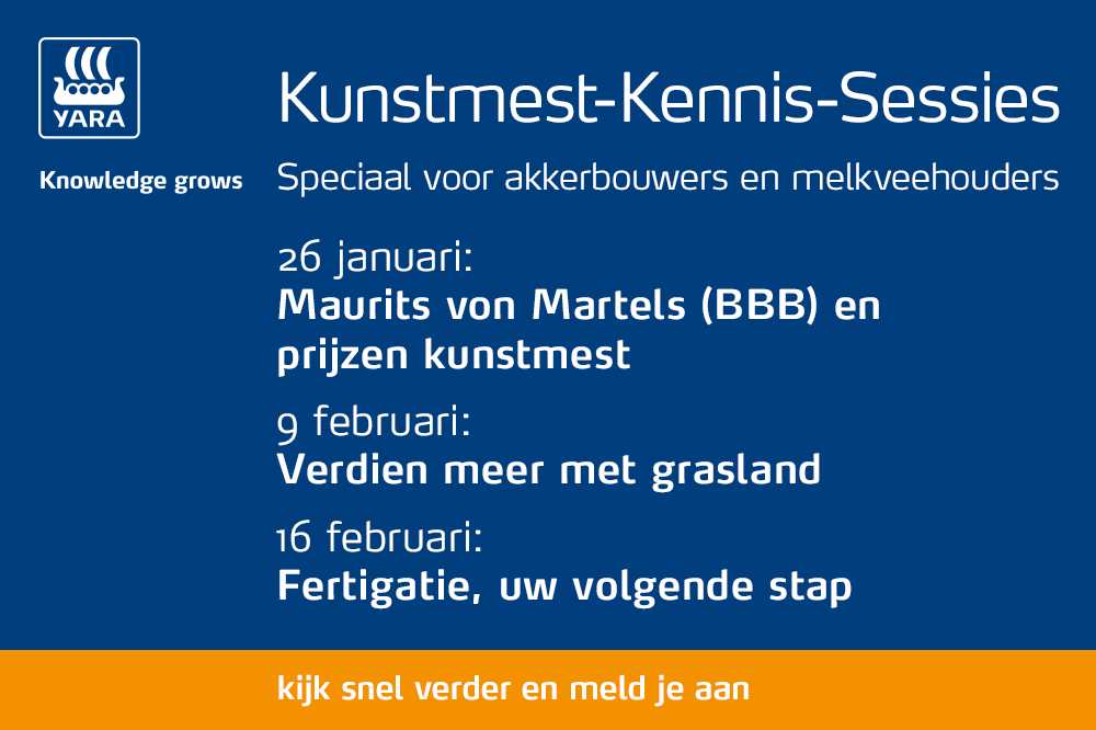 De drie online kennis-sessies die YARA dit voorjaar organiseert, zijn volgens marketingmanager Peter Arkenbout van YARA Benelux vooral bedoeld om kennis over meststoffen en bemesting met agrarische ondernemers te delen. Zeker in een tijd van hoge kunstmestprijzen zoeken die naar mogelijkheden om de efficiency van de bemesting te verbeteren. YARA beschikt over eigen onderzoeksafdelingen en werkt samen met distributeurs in het praktijkonderzoek naar een efficiënte inzet van de meststoffen. Resultaten en praktijkervaringen zullen in de kennis-sessies naar voren komen. Aanmelden kan via www.yaradigifarm.nl.