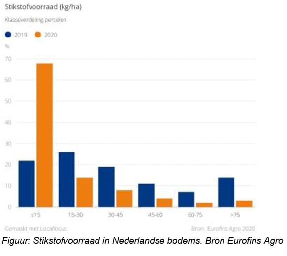 Eurofins Agro ziet dit jaar met name veel lagere stikstofvoorraden vergeleken met voorgaande jaren, deels vanwege meer uitspoeling en deels vanwege lagere mineralisatie. De verschillen tussen percelen en regio’s blijken bovendien vele malen groter dan gebruikelijk, zie de onderstaande grafiek.