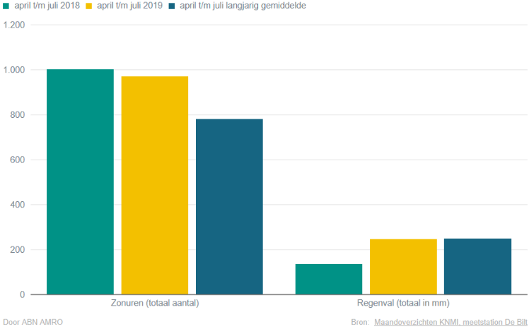 Laten we beginnen met de overeenkomsten tussen beide zomers tot nu toe. Het aantal zonuren en tropische dagen (30°C of hoger) ligt tot nu toe (april tot en met juli) zowel in 2018 als in 2019 duidelijk boven het langjarig gemiddelde. Bovendien is er wederom een groot neerslagtekort in het oosten en zuiden van Nederland.