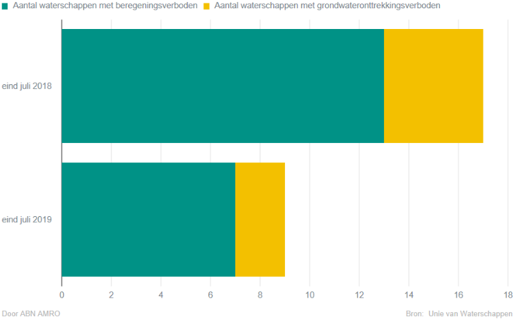 Door dit gemengde beeld is momenteel slechts één duidelijke groep economische verliezers aan te wijzen: de boeren in Oost- en Zuid-Nederland, waar het neerslagtekort op dit moment net zo groot is als in het droogste jaar van de afgelopen eeuw (1976). Op hun hoge zandgronden is geen wateraanvoer van rivieren en kanalen mogelijk. Met twee zeer droge jaren op rij zouden wij niet verbaasd zijn als er vanwege afnemende liquiditeit bij boerenbedrijven druk komt op de lust tot investeren, bijvoorbeeld in akkerbouwgrond en grasland in deze gebieden.