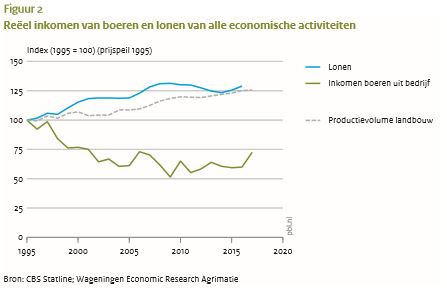 Bij een kostenefficiënte productie van bulkgoederen hoort bijvoorbeeld specifiek veevoer, een hoogtechnologische melkrobot, of technologie die de lucht in de stallen zuivert. Hierdoor is de gespecialiseerde boer sterker afhankelijk geraakt van gespecialiseerde voerleveranciers en specifieke technologiebedrijven. Zonder leveranciers, afnemers, financiers, adviseurs, loonwerkers, en specialistische kennis is het veelal onmogelijk mee te komen op de internationale markten waar de meeste boeren direct of indirect voor produceren. Via deze ontwikkelrichting zijn ontegenzeggelijk grote efficiëntiewinsten geboekt. De productie is opgeschroefd, terwijl de kosten en de milieudruk per eenheid product zijn gedaald. Boereninkomens profiteren echter maar beperkt van die efficiëntiewinst en blijven in grote delen van de landbouw onder druk staan (figuur 2).