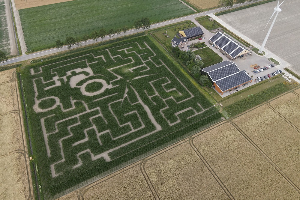 Het maisdoolhof bij vergaderlocatie ‘Leven van de wind’ in Wieringerwerf is een ware publiekstrekker. Terwijl het mais nu hoog is en er echt gedoold wordt, zijn vanuit de lucht ook duidelijk een trekker en een windmolen zichtbaar. Het maisdoolhof is door Lars Bijl van Loonbedrijf Sjef Houtenbos uit Schagen gezaaid met een op sectiegestuurde Väderstad Tempo. Het resultaat van een enthousiasme ondernemer en de samenwerking tussen de loonwerker en de gps-specialisten van Raven Europe.