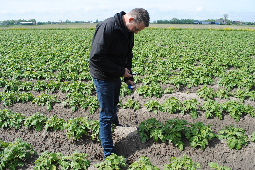 Het NPPL-project loopt op het bedrijf van Van der Poel over drie sporen, die met name op het akkerbouwgedeelte zijn gericht. “Allereerst plaatsen we gericht in de percelen vochtsensoren en we hebben twee weerstations. We experimenteren hier nog altijd mee, maar het idee is om uiteindelijk te beregenen op maat in de vroege aardappelen en vroege plantuien. Het is met deze sensoren wel belangrijk om te bepalen wat je er mee wilt en wat je kunt. We plaatsen ze nu op knol- en op ploegniveau. Dat moet uiteindelijk een bruikbaar beregeningsadvies opleveren. Nou is de beschikbaarheid van zoet water bij ons op zich niet een groot probleem. We hebben voldoende zoet water. Dat wordt erg goed gemeten. Ondanks dat we relatief dichtbij de zee zitten, is van verzilting hier geen sprake.”