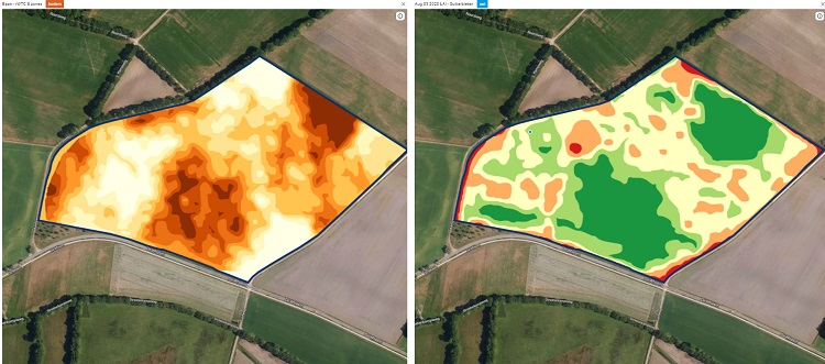 Ook een bodemscan kan interessante verbanden laten zien, zoals in de droge zomer van 2020. Begin augustus werd de droogte merkbaar op de droogste delen van dit suikerbietenperceel. Met een SoilXplorer bodemscan was in de winterperiode al het vochthoudend vermogen (links) in kaart gebracht. Op de satellietbeelden in de loop van het groeiseizoen werd het e‑ ect daarvan zichtbaar in de LAI (leaf area index), een maat voor de bladmassa van het gewas (rechts). De groene vlakken hebben een index-waarden van tegen de 3.5, terwijl de lichtere delen of rode delen rond de 3.0 zitten. (Afb. 3)