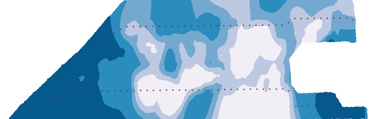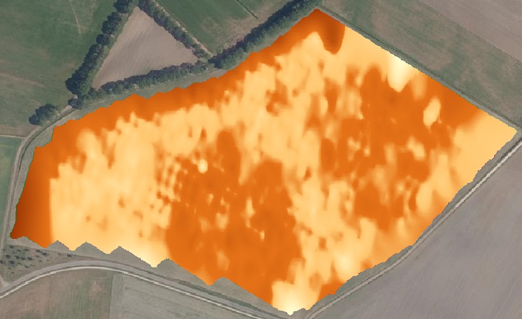 De bodem in kaart gebracht met de SoilXplorer-bodemscan en daarvan is een kaart van het vochthoudend vermogen gemaakt (Afb. 5). De route van de beregeningshaspel is bepaald, waardoor er vlakken van honderd bij tien meter ontstaan om de gift te variëren.