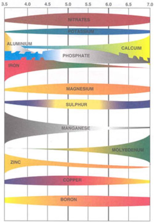 De pH is een belangrijke parameter, vooral om de voedingsstoffen in de bodem ook beschikbaar te krijgen voor de planten, zoals je kunt zien in de schematische weergave. De dikte van de balk geeft de beschikbaarheid van nutriënten weer bij een bepaalde pH-KCl (op de x-as) (Afb. 1) (bron: handboek Bodem en Bemesting.)