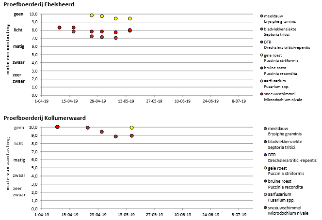 Door het groeien van de tarwe is de aantasting van septoria in week 19 in verhouding iets afgenomen. De aantasting van gele roest op Ebelsheerd zijn deze week niet verder toegenomen. Op Kollumerwaard is in het ras Benchmark nu ook enige gele roest geconstateerd.