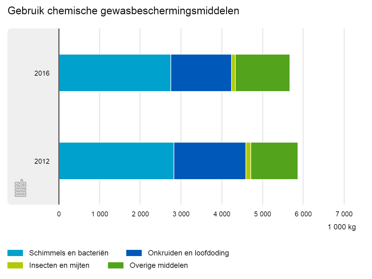 In 2016 werd bijna 2,8 miljoen kilogram aan chemische gewasbeschermingsmiddelen ingezet ter bestrijding van schimmels en bacteriën, bijna 3 procent minder dan in 2012. Voor onkruidbestrijding en loofdoding is bijna 1,5 miljoen kilogram gebruikt, ruim 15 procent minder dan in 2012.