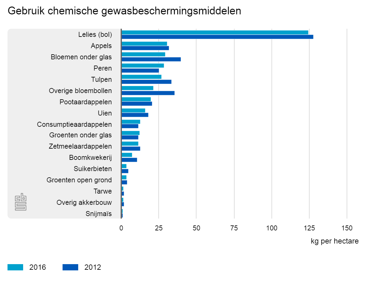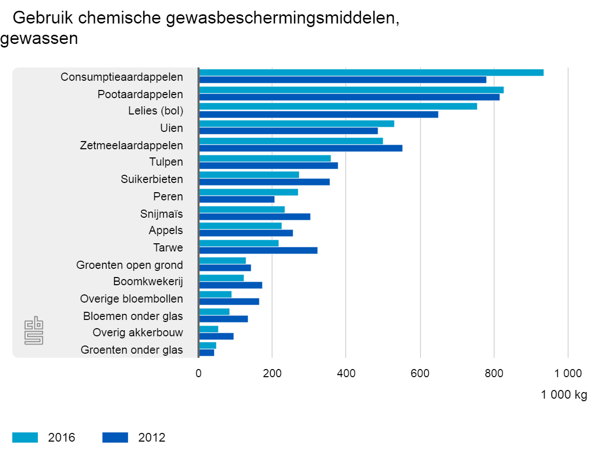 De akkerbouw gebruikte in 2016 bijna 3,6 miljoen kilogram chemische gewasbeschermingsmiddelen, waarvan 2,3 miljoen kilogram voor de bescherming van consumptie-, poot- en zetmeelaardappelen. Dat is 40 procent van alle chemische middelen die in 2016 in de landbouw zijn gebruikt. Bij de teelt van bloembollen is 1,2 miljoen kilogram gebruikt, bij de fruitteelt 500 duizend kilogram.