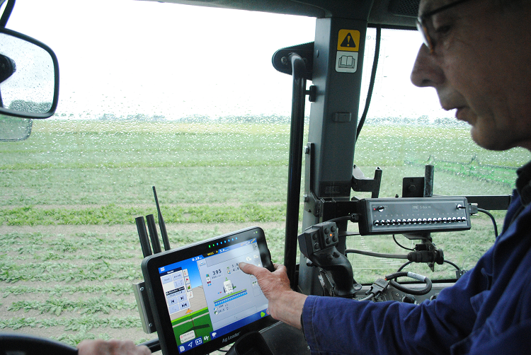 De veldspuit is aangesloten op een Isobus AG Leader-computer. Terwijl hij de taakkaart van de AG Leader op het scherm in zijn cabine instelt, vertelt de loonspuiter dat hij eerder een CHD veldspuit had. “Dat heeft ook meegewogen in mijn keuze. Met de mensen in Ter Apel kan ik lezen en schrijven. Bovendien zit de dealer, Geertsema uit Munnekezijl, op nog geen tien kilometer afstand.” Door zijn ervaring, is Hospers ook bekend met de joystick waarmee de veldspuit wordt bediend. “Niet onbelangrijk. Iemand van 63 jaar leer je niet snel nieuwe dingen, daar moet ik ook eerlijk in zijn.” De joystick heeft 24 functies, die communiceren met de eenvoudige bediening op het touchscreen. Zowel de trekker als de veldspuit zijn uitgevoerd met gps en werken met taakkaarten. De kleppen worden elektrisch geschakeld, waardoor sectie-afsluiting om de vijftig centimeter mogelijk is. Bij het verwerken van taakkaarten heeft Hospers de mogelijkheid om iedere vijftig centimeter met drie verschillende doseringen te spuiten.