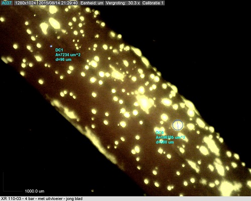 Aan de spuitvloeistof is een marker toegevoegd. Deze is met een speciale camera zichtbaar te maken op het blad (zie foto onder alinea). Zo kan Remijn aan de hand van de foto’s – voortkomend uit de diverse spuitbeelden – de verschillende spuiten en doppen goed met elkaar vergelijken. “We kunnen zo ook laten zien hoe groot de druppels zijn en wat het effect is van bijvoorbeeld een hechter of uitvloeier.”