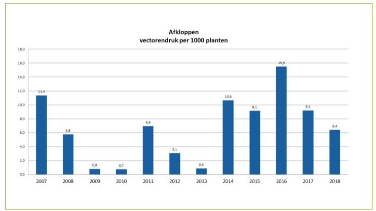 In de grafiek hieronder is de vectordruk per 1000 planten van de afgelopen jaren te zien.