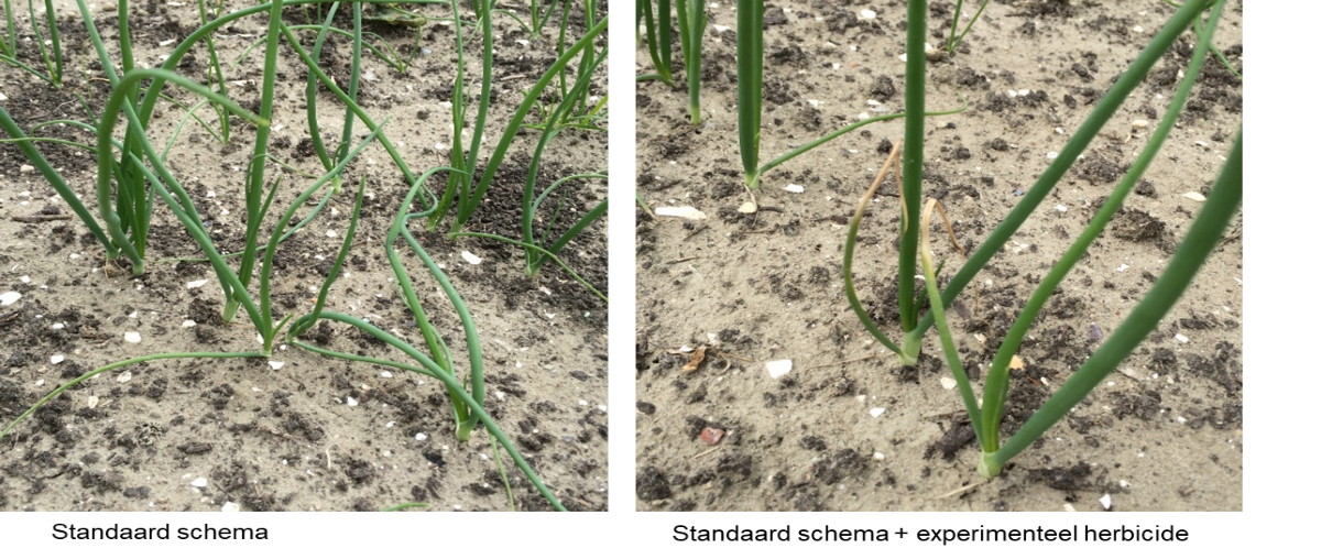 Experimenteel herbicide is ingezet in het kramstadium en eerste pijp drie centimeter. Vervolgens is er drie dagen na de tweede toepassing negen millimeter neerslag gevallen in een korte heftige bui. Vier dagen na deze bui is op grijze grond en afgehard gewas een contactbespuiting in alle objecten uitgevoerd. Barneveld: “Een week na de contactbespuiting is vastgesteld dat inspoeling van de herbiciden, toegepast in het eerste pijp drie centimeter stadium, tot gevolg heeft gehad dat er behoorlijke visuele schade is vastgesteld in het object met het experimentele middel.”
