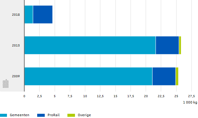 Het grootste deel (69 procent) van de gewasbeschermingsmiddelen die Nederlandse overheidsinstellingen in 2018 gebruikten, is ingezet om spoorbanen en rangeerterreinen onkruidvrij te houden. In totaal werd 3 250 kilogram aan gewasbeschermingsmiddelen voor dit doel ingezet, 16 procent minder dan in 2013. Toen werd er nog 3 850 kilogram gebruikt.Door de spoorbeheerder werd in 2018 met name het middel glyfosaat ingezet. Daarnaast werden ook MCPA en 2,4 D gebruikt.