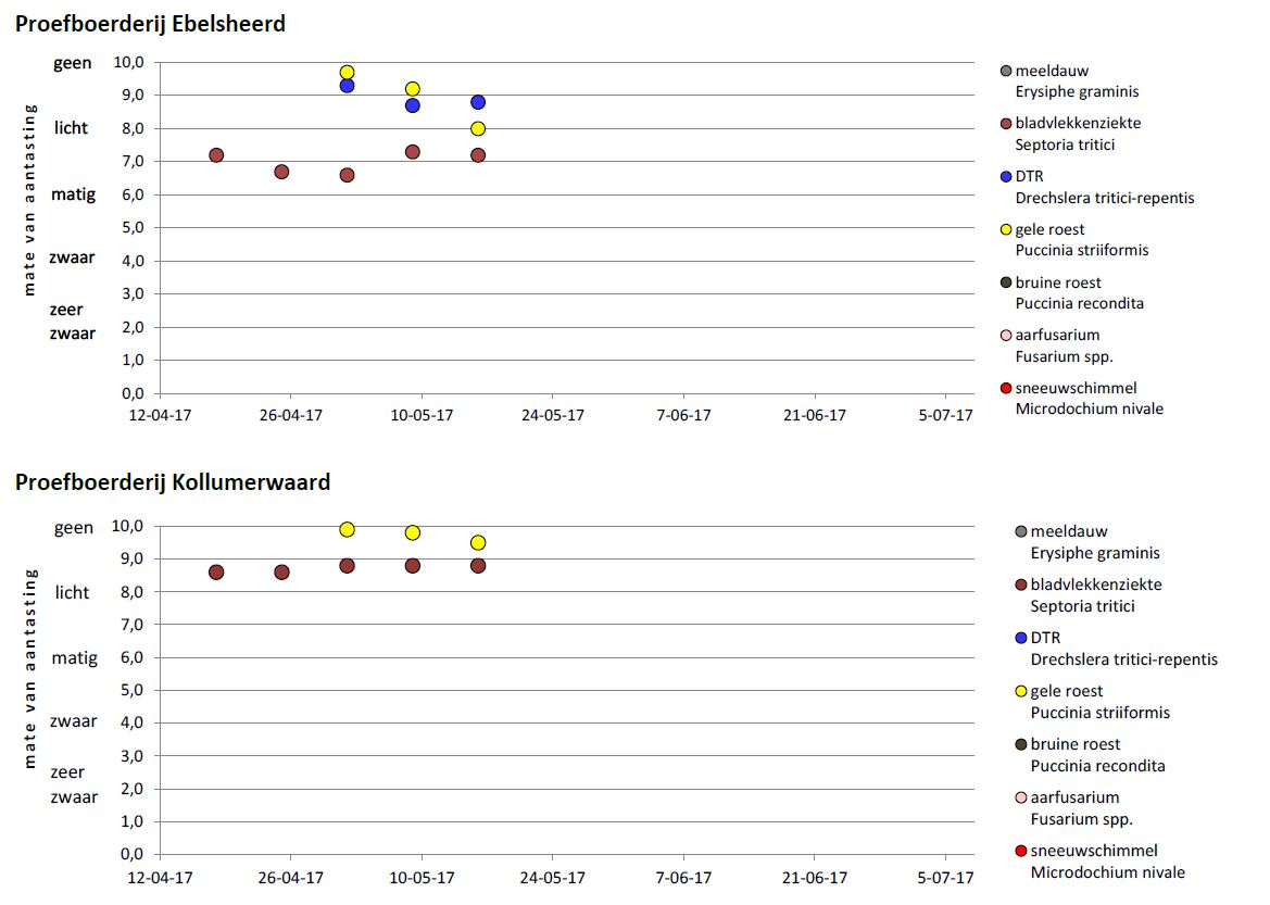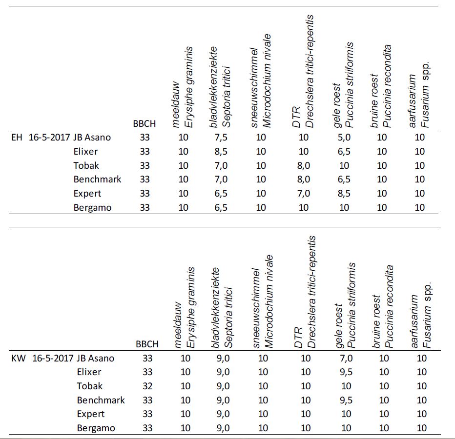 De aantasting van gele roest is op beide locaties toegenomen. Op Ebelsheerd is de aantasting sterker toegenomen dan op Kollumerwaard. Op Kollumerwaard is het ras Elixer ook aangetast en op Ebelsheerd laat het ras Expert ook een aantasting zien. De aantasting van septoria is redelijk gelijk gebleven. Bijna alle rassen staan nu in het derdeknoopstadium.