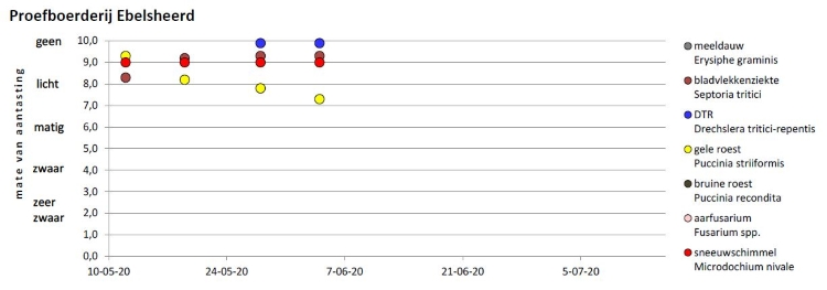 De graanziektebarometer is een weergave van het verloop van aantasting van de meest voorkomende ziekten in wintertarwe gedurende het groeiseizoen. De aantastingen worden wekelijks bepaald op de proefboerderijen Ebelsheerd (EH) en Kollumerwaard (KW).