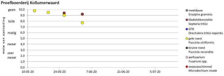 Op beide locaties is de aantasting van gele roest weer iets toegenomen. De aantastingen van septoria zijn zo goed als stabiel gebleven t.o.v. vorige week. De meeste tarwes staan inmiddels in volle bloei. Met het voorspelde wisselvallige weer is de kans op een infectie met aarfusarium reëel.