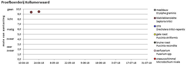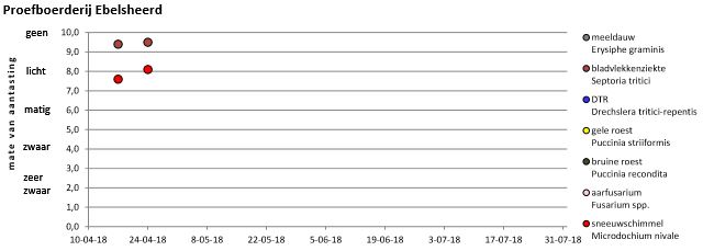 De aantasting van septoria is, voor zover je van een aantasting kan spreken, op beide locaties iets afgenomen. Dit heeft te maken met het groeien van de tarwe. Ook de sneeuwschimmelaantasting op Ebelsheerd is iets gedaald.  Op Kollumerwaard staan de eerste rassen inmiddels in het tweede knoop-stadium.