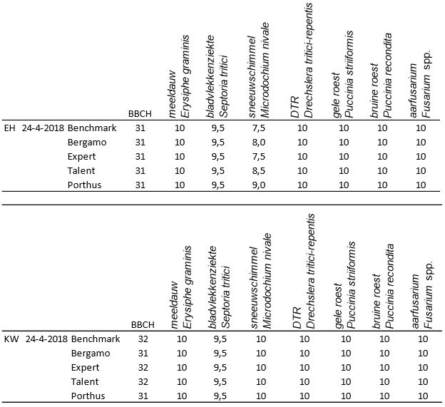 De waarnemingen zijn gedaan in een reeks rassen met verschil in resistentieniveau. De cijfers zijn afkomstig van de meest recente Rassenbulletins of, bij het ontbreken van informatie ervan, uit andere veldproeven. De waarnemingen zijn gedaan in een gewas waarin geen ziektebestrijding heeft plaatsgevonden.