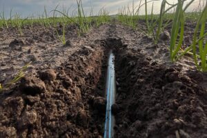 Bij akkerbouwer Sipma is de drainage nu verdiept aangelegd met de mogelijkheid het peil minimaal op te zetten tot één meter onder maaiveld. De drainage is aangesloten op een verzamelleiding met een put om het zoete water op te vangen. De zoetwaterbuffer is hiermee vergroot en het neerslagwater beter vastgehouden. In de sloot staan peilbuizen om het EC te meten in het grondwater en bodemvocht. Met de drainage kan Sipma dus langer gebruik kan maken van zoet water.”