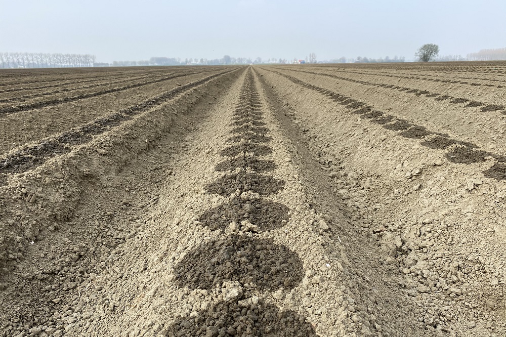 De meest ideale plek voor de Aqua Traxx driptape is volgens Van Antwerpen op anderhalf maximaal vier centimeter in de rug of bed. “Sowieso niet in de rij, maar zo dicht mogelijk bij de plant. Hoog in de rug zorg je met driptape voor een soort kegel, waarbij de buitenzijde van de rug droog blijft en binnenin de rug het vervolgens vochtig wordt. Het water komt dichtbij de wortel. Bovendien voed je tussen de rug meer het onkruid dan het gewas. Ik denk niet dat het klopt dat wortels met druppelirrigatie lui zouden worden, want in mijn ogen geeft je dan gewoon te veel water. Met druppelirrigatie kun je juist perfect doseren. Het is wel zo dat de aardappel, net als gras, enige stress nodig heeft om gezonde wortels te ontwikkelen.”