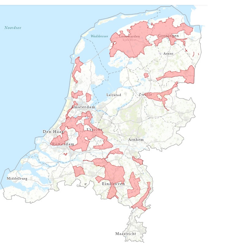 De onderstaande kaart toont de situatie op basis van de bemonsteringen die zijn uitgevoerd tot en met 2022. De rode gebieden zijn de gebieden waarvoor een verbod geldt op het gebruik van oppervlaktewater voor de beregening van zetmeel- en consumptieaardappelen.