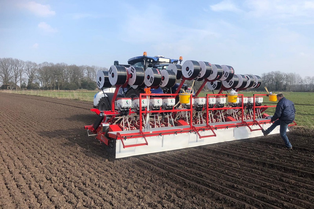 Feitelijk is alleen het zaaihuis van de hagelnieuwe driebeds Agricola-precisiezaaier behouden. De Italiaanse machine krijgt een werkbreedte van 6,75 meter (drie keer een bed van 2,25 meter) waarmee acht rijen scherp in een bed kunnen zijn gelegd. Tussen de rijen is in de eerste bewerking in ieder bed met snijschijven vier rijen met Toro AquaTraxx-driptape aangebracht, daarna volgt het uienzaad. Met kouter worden zowel het zaad als de druppelirrigatie met grond toegedekt.