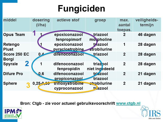 Bij het afwisselen van middelen zijn er een aantal eisen waar u rekening mee moet houden. Sinds 2014 mogen middelen die strobilurinen bevatten (Sphere en Retengo Plust) maximaal 50% van het aantal bespuitingen tegen cercospora uitmaken. De andere bespuitingen tegen cercospora dient u uit te voeren met middelen die geen strobilurinen bevatten (Opus Team, Spyrale, Difure Pro, Borgi of Score 250 EC). Wanneer slechts één toepassing tegen cercospora in het hele seizoen wordt uitgevoerd, kunt u wel kiezen voor een middel met een strobilurine. Als er geen cercospora aanwezig is op het perceel, mogen strobilurinebevattende middelen maximaal 2x per teeltseizoen worden toegepast. Uitzondering is Retengo Plust, dit middel mag u maximaal één keer in het seizoen toepassen. Het heeft een betere nevenwerking tegen stemphylium dan Sphere en Spyrale, Borgi of Difure Pro, die een beperkte nevenwerking hebben. Deze bindende richtlijnen zijn gegeven door het FRAC (Fungicide Resistance Action Committee; www.frac.info) en zijn bedoeld om resistentievorming tegen te gaan. In figuur 1 staan de in de bietenteelt beschikbare fungiciden weergegeven met hun indeling in groepen.