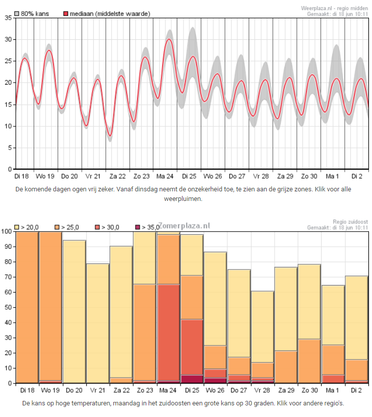 En hoe zit het dan de komende week, de week van 24 juni tot 1 juli? Hiervoor kunnen we voor Nederland het best naar de pluim kijken die ons meer detail laat zien. De week start warm, maar dinsdag slaat het weer waarschijnlijk al om en wordt het wisselvalliger met lagere maxima en kans op buien. Duidelijk is te zien dat de verwachting voor deze week nog niet in beton gegoten is want vanaf dinsdag is er een flinke spreiding te zien in de verwachting. Wat dat betreft is het vervolg van de huidige week een stuk zekerder en kan het zondag weer regionaal zomers worden en maandag tropisch in het zuidoosten.